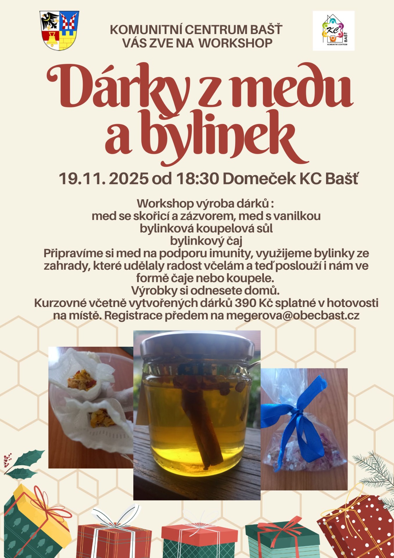 Těšit se můžete na voňavé tvoření s paní Kamilou Rubešovou z Kozomínského medu. Kurzovné včetně vyrobených dárků je 390 Kč. Je nutná registrace předem na megerova@obecbast.cz