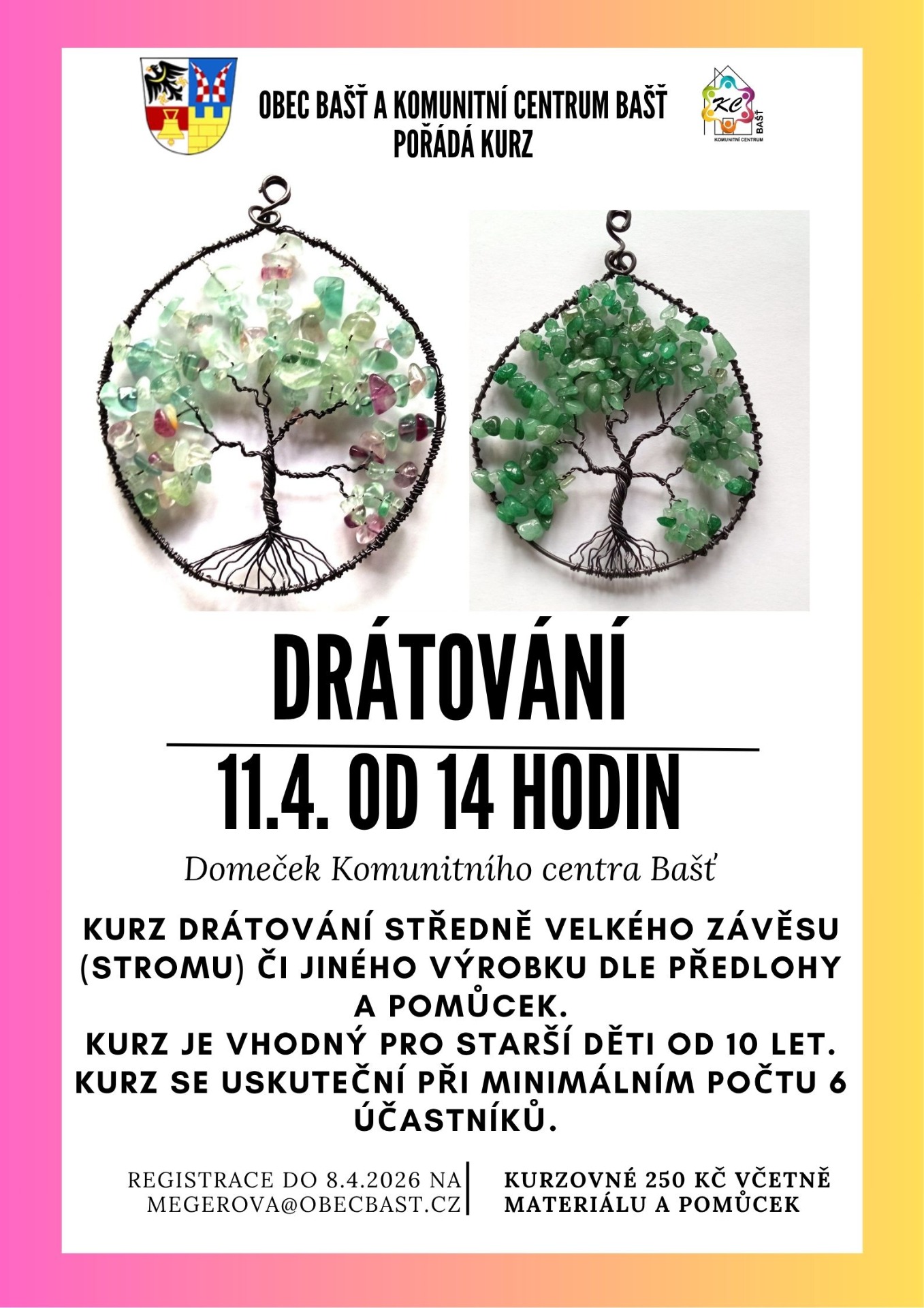 Přijďte si vyzkoušet kreativní techniku drátování a vytvořit si vlastní dekoraci – středně velký závěs (strom) nebo jiný výrobek dle předlohy a dostupných pomůcek. V sobotu 11.4. od 14 hodin v Domečku Komunitního centra Bašť .Kurz je vhodný pro starší děti od 10 let.