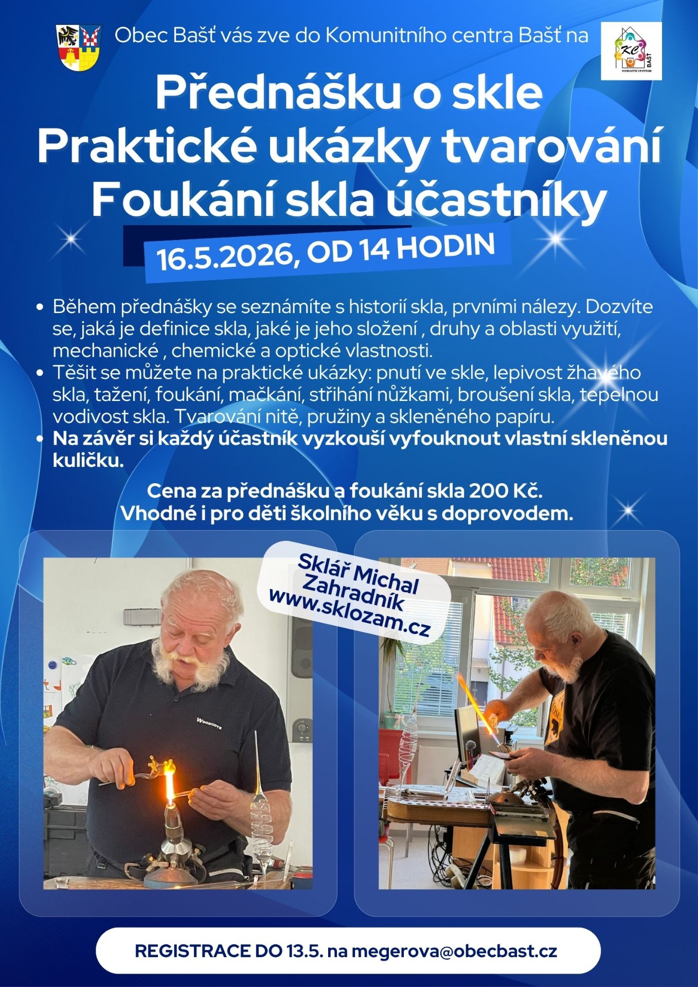 Srdečně vás zveme na zajímavou přednášku o skle, jeho historii, složení a využití. Součástí přednášky budou praktické ukázky práce se sklem od foukání až po tvarování spirály. Na závěr bude mít každý účastník jedinečnou příležitost vyfouknout si svoji kuličku ze skla. Celou akcí vás provede sklář Michal Zahradník, který je představitelem nejstaršího sklářského rodu v Čechách. Přednáška s praktickou části se uskuteční v sobotu 16.5. od 14 hodin v malém sále Komunitního centra Bašť. Akce je vhodná i pro děti školního věku s doprovodem. Cena je 200 Kč. Registrace předem na megerova@obecbast.cz